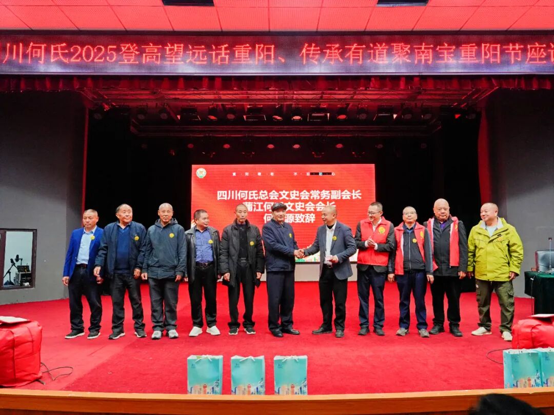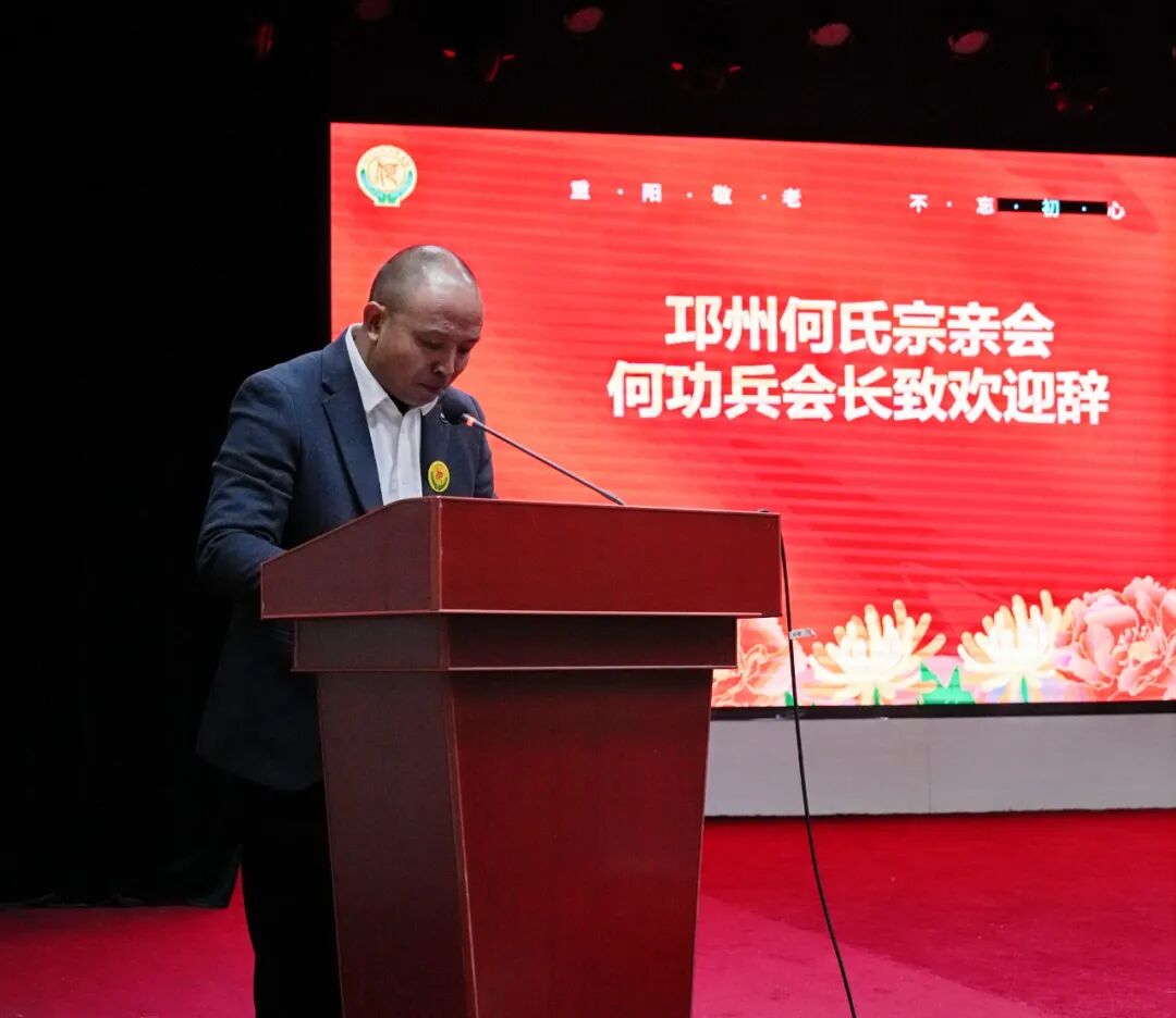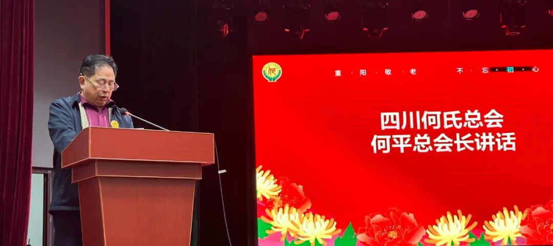 随后,世何总常务副总会长、省总会何平总会长发表讲话。他代表四川何氏文化团体全体成员,向全省各地年逾古稀的老宗长们致以最诚挚的节日问候 。他回顾了何氏一族自「庐江衍派」入川六百载的历程,还特别强调了老宗长 们在守祠堂、修族谱、立家规等方面的重要贡献,将「孝悌忠信」的祖训化作春风细雨。他承诺重阳敬老永不限于佳节,省总会倡导各地各支系宗亲组织团体结合本系实际情况开展每月一次「宗长慰问日」,专人聆听建议;每年腊月开展「暖冬行动」,为独居长者送温暖。
