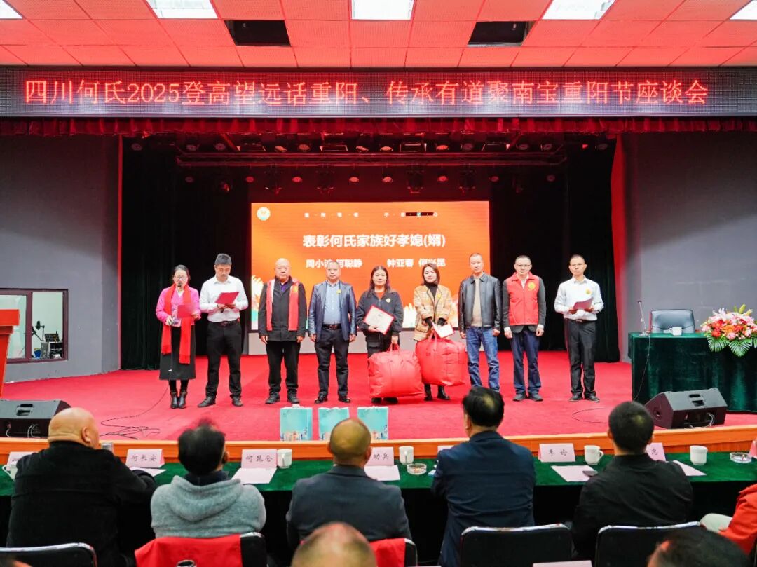 活动中,邛州分会表彰了两位在“四川何氏2025重阳登高望远·传承有道”活动中被评选为“孝亲爱老睦邻、勤俭持家有道”的“何氏好儿媳”——周小波、钟亚春。何聪静、周小波夫妇,何兴昆、钟亚春夫妇,共同登台接受表彰,成为邛州何氏好家风的优秀代表。