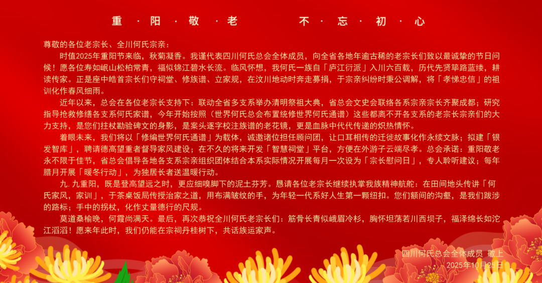 重阳节是敬老孝亲的节日。为了在全川各地何氏宗亲中做好敬老孝亲的示范引领作用,省总会连续两年开展了对“为何氏家族发展做出突出贡献的宗长宗亲代表进行慰问”。去年慰问了60名,今年全川70名(慰问品<信>已寄出)。